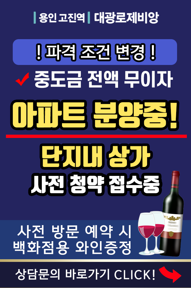 | 용인 고진역 |대광로제비앙 방문예약 고객의 개인정보를 수집합니다. 수집한 개인정보는 방문예약 이외의 목적으로는 사용하지 않으며, 모집 기간 완료 후 즉시 파기합니다. 개인정보의 수집 및 이용에 대한 동의를 거부할 수 있으며, 이 경우 방문예약 접수가 어려울 수 있습니다.